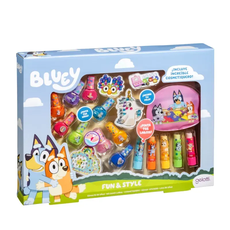 PRODUCTOS INFANTILESMaquillaje InfantilSet de MaquillajesBLUEY - 9 esmaltes + 5 Lip balm + Cosmetic PVC bag + Sticker small + 2 Gems medium