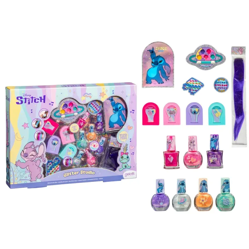 7 Nail Polish + 4 Hair Chalp circles + PVC Eye Shadow palette (x5) + 1 PVC cosmetic bag + 2 gems small + 2 Fake hair extensions, STITCH